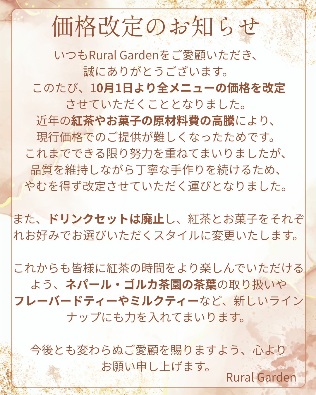 | メール | ruralgarden_tearoom@outlook.com ※e-mailからのご予約は承っておりません。 |